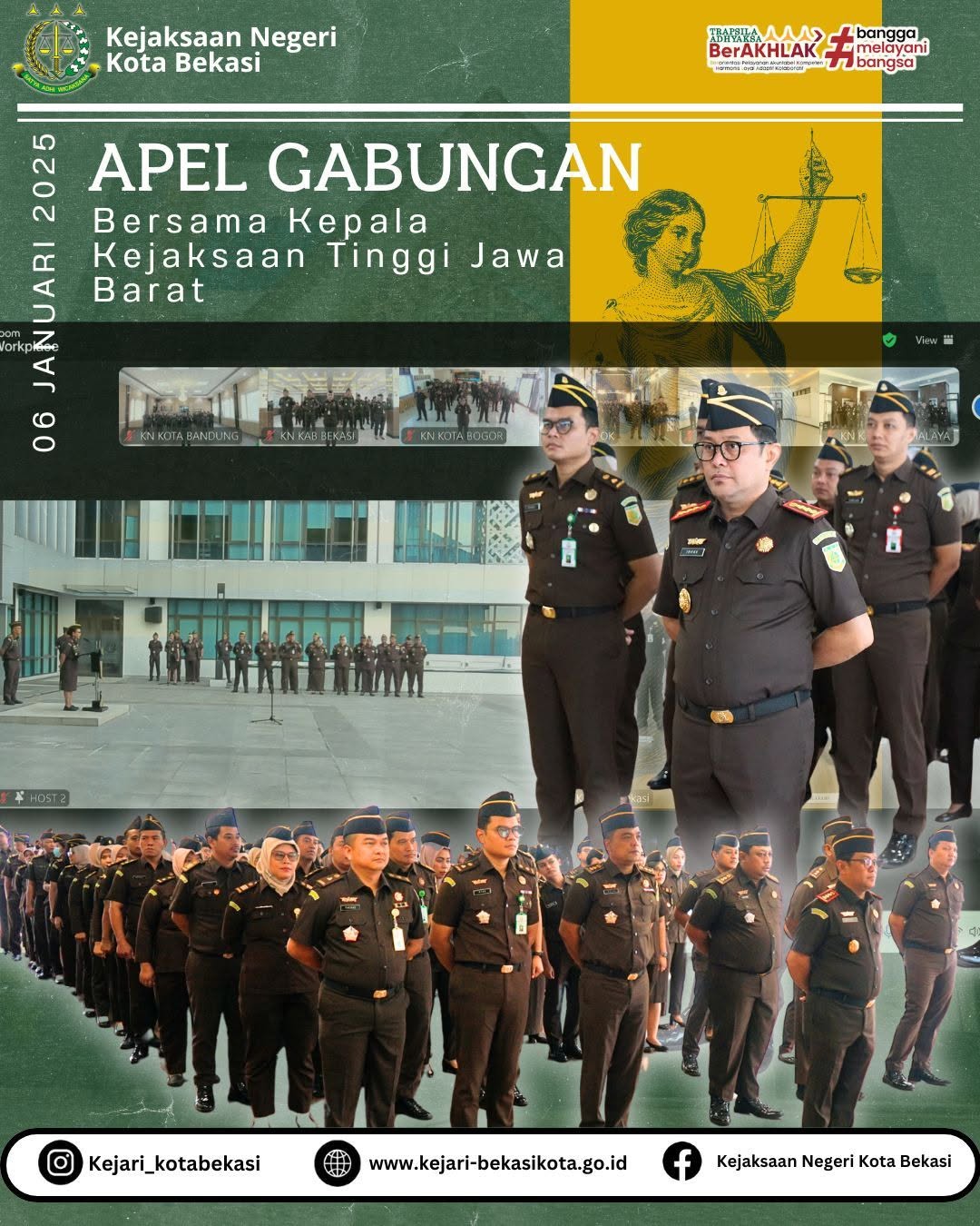 Senin, 06 Januari 2025, Bertempat di Aula Lt.5 Kejaksaan Negeri Kota Bekasi, Kepala Kejaksaan Negeri Kota Bekasi Imran Yusuf, S.H., M.H. para Kasi dan Kasubag, serta seluruh Staf di lingkungan Kejaksaan Negeri Kota Bekasi telah mengikuti Apel Gabungan yang diselenggaran oleh Kejaksaan Tinggi jawa Barat secara virtual melalui video conference zoom. Apel gabungan ini diikuti oleh seluruh Kejaksaan Negeri yang ada di wilayah hukum Jawa Barat. Kepala Kejaksaan Tinggi Ibu Katarina Endang Sarwestri, S.H., M.H. selaku Penerima Apel memberikan ucapan selamat tahun baru serta mengapresiasi semangat kinerja seluruh kejaksaan negeri di Wilayah Hukum Jawa Barat.