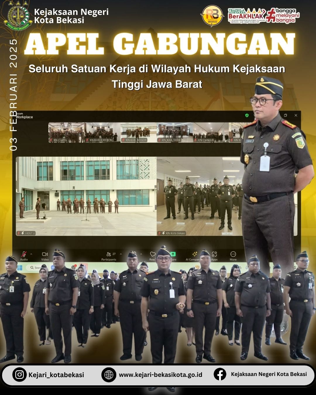 Senin, 03 Februari 2025, Bertempat di Aula Lt.5 Kejaksaan Negeri Kota Bekasi, Kepala Kejaksaan Negeri Kota Bekasi Imran Yusuf, S.H., M.H. para Kasi dan Kasubag, serta seluruh Staf di lingkungan Kejaksaan Negeri Kota Bekasi telah mengikuti Apel Gabungan yang diselenggaran oleh Kejaksaan Tinggi jawa Barat secara virtual melalui video conference zoom. Apel gabungan ini diikuti oleh seluruh Kejaksaan Negeri yang ada di wilayah hukum Jawa Barat dengan Kepala Kejaksaan Tinggi Ibu Katarina Endang Sarwestri, S.H., M.H. selaku Penerima Apel.