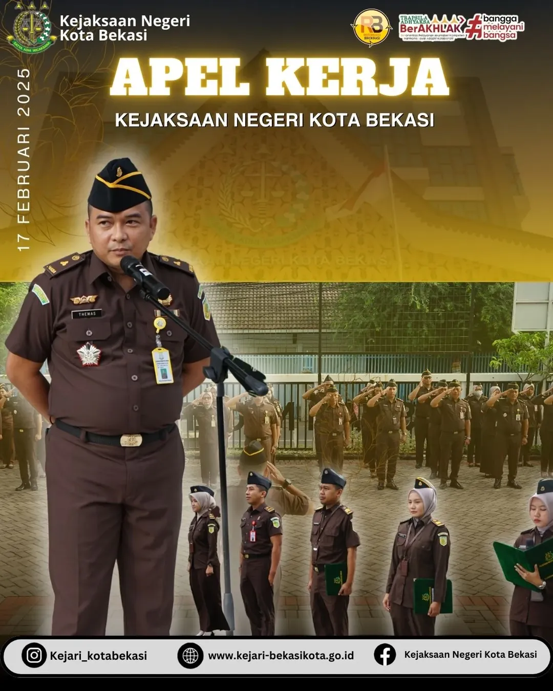 Apel Kerja dipimpin oleh Kepala Sub Bagian Pembinaan Kejaksaan Negeri Kota Bekasi Arthemas Sawong, S.H., M.H. Dalam amanatnya Kasubag Bin memberikan apresiasi terhadap jaksa dan staf yang telah mengikuti apel pagi ini, selain itu mengingatkan untuk selalu disiplin baik dalam waktu maupun pengenaan Gamjak.