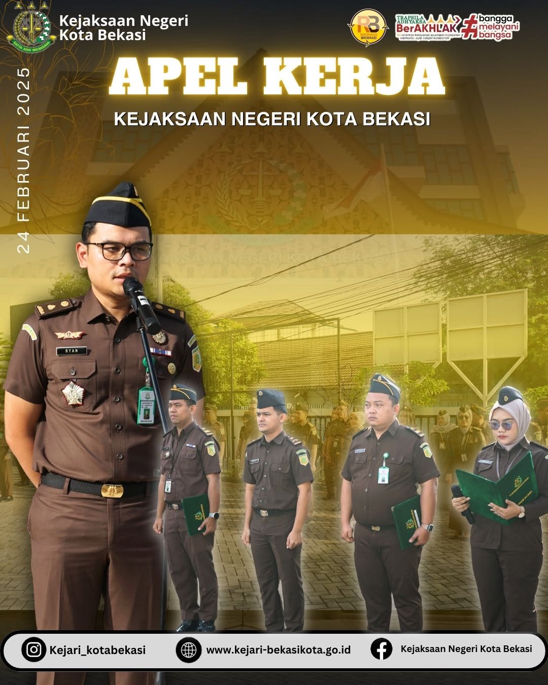 Apel Kerja dipimpin oleh Kepala Intelijen Kejaksaan Negeri Kota Bekasi Ryan Anugrah, S.H.. Dalam amanatnya Kasi Intel untuk meningkatkan kedispilinan seluruh jajaran Kejaksaan Negeri Kota Bekasi.