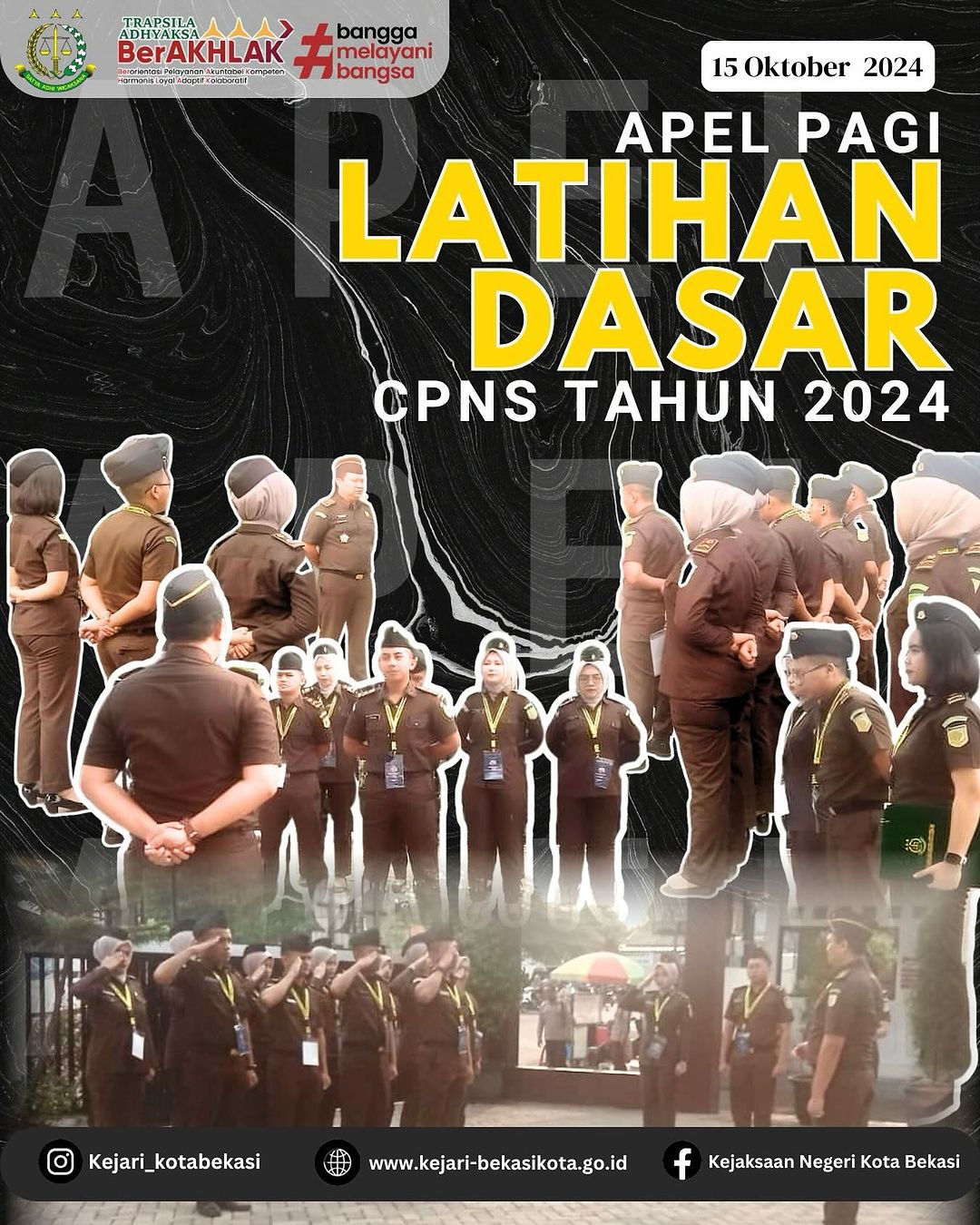 Selasa, 15 Oktober 2024, telah dilaksanakan Apel Pagi Pelatihan Dasar dengan Kepala Seksi PAPBB Lier Budhi Trapsilo, S.H. selaku penerima apel dan diikuti oleh seluruh CPNS di lingkungan Kejaksaan Negeri Kota Bekasi yang dilaksanakan di halaman Kejari Kota Bekasi.