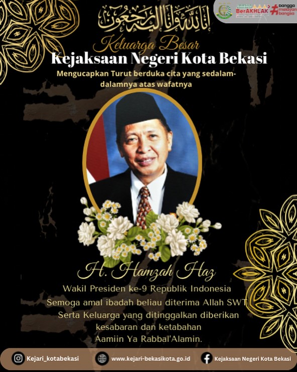 Keluarga Besar Kejaksaan Negeri Kota Bekasi mengucapkan turut berduka cita yang sedalam-dalamnya atas meninggalnya Bapak H. Hamzah Haz, Wakil Presiden Ke-9 Republik Indonesia.