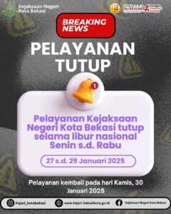 Pelayanan Tutup Kejaksaan Negeri Kota Bekasi tutup selama libur nasional Senin s.d. Rabu tanggal 27 s.d. 29 Januari 2025. Eitss