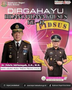 Segenap keluarga besar Kejaksaan Negeri Kota Bekasi mengucapkan Dirgahayu Tindak Pidana Khusus Kejaksaan Republik Indonesia ke 42. “PIDSUS CERDAS, PASTI