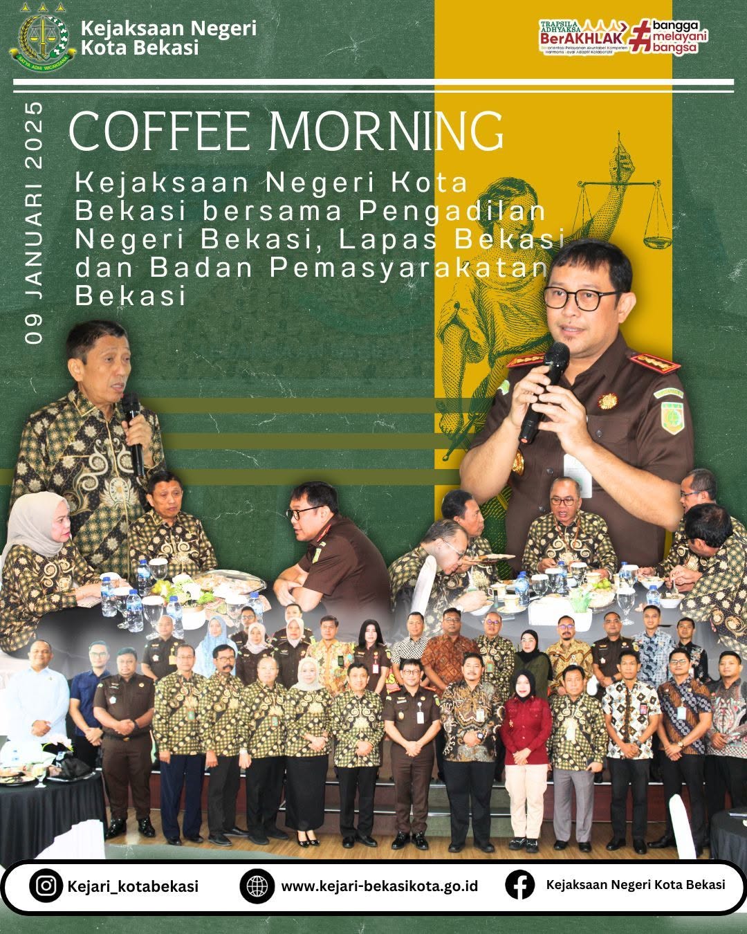 Kamis, 09 Januari 2025, bertempat di Aula Lt.5 Kejaksan Negeri Kota Bekasi, Kepala Kejaksaan Negeri Kota Bekasi Imran Yusuf, S.H., M.H. beserta jajaran menggelar kegiatan Coffee Morning bersama Pengadilan Negeri Bekasi, Balai Pemasyarakatan Kelas II Bekasi, Lembaga Pemasyarakatan Kelas IIA Bekasi, Rumah Tahanan Kelas IIA Jakarta Timur.