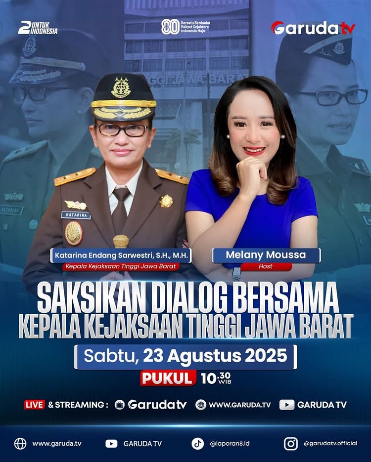 Ibu Katarina Endang Sarwestri, S.H., M.H. (Kepala Kejaksaan Tinggi Jawa Barat) akan hadir dalam dialog eksklusif bersama host Melany Moussa di Garuda TV.