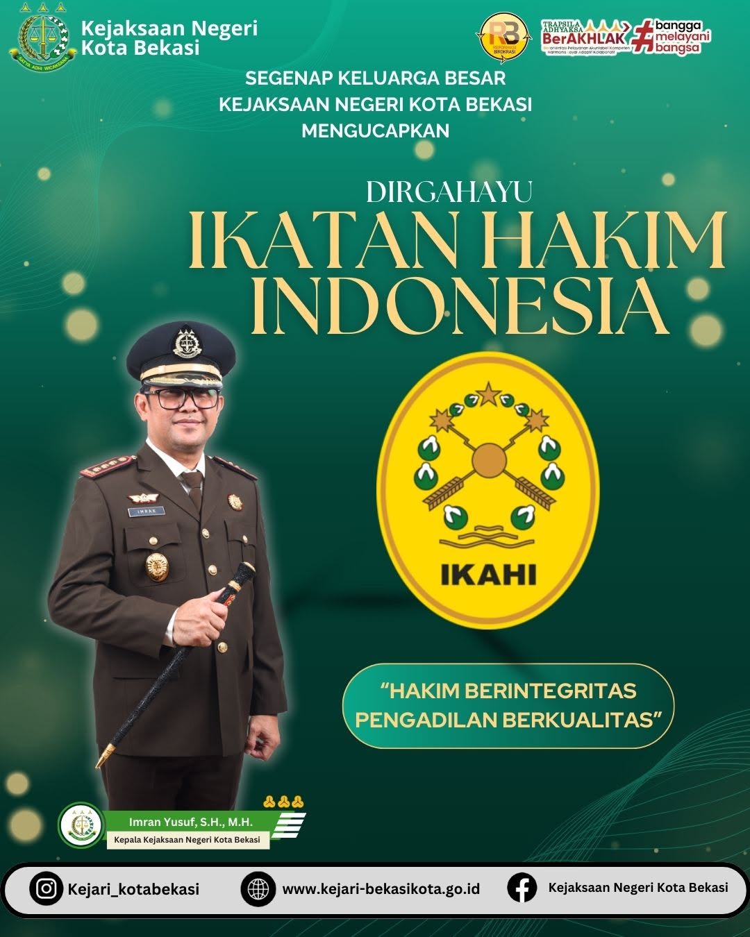 Segenap keluarga besar Kejaksaan Negeri Kota Bekasi mengucapkan Dirgahayu Ikatan Hakim Indonesia.