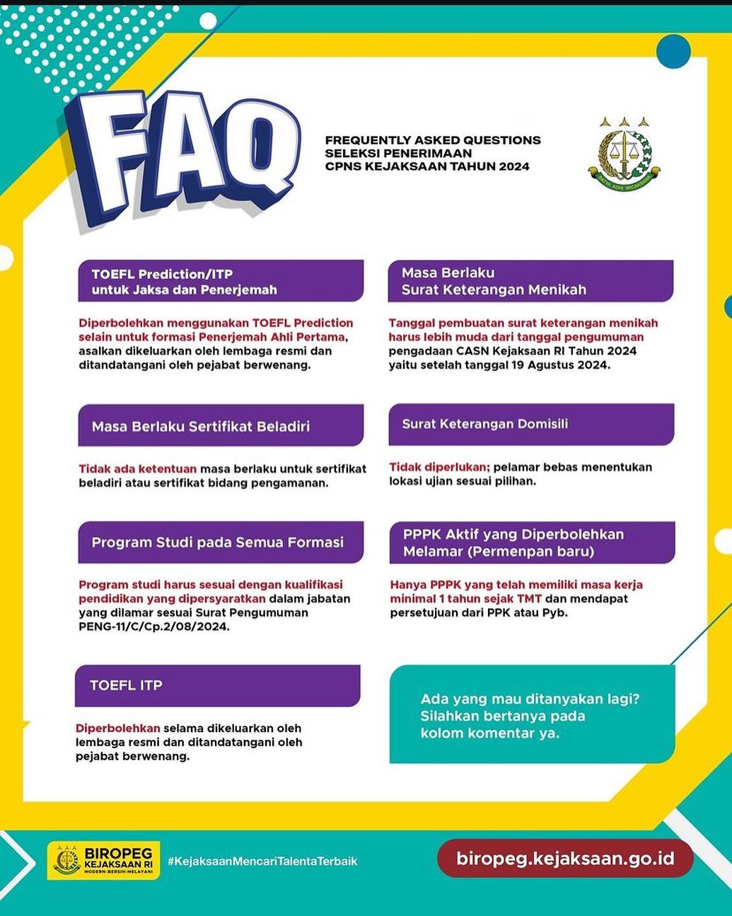 Jangan sampai terlewat informasi penting ini! Cek FAQ seputar persyaratan seleksi CASN Kejaksaan RI 2024. Pastikan semua dokumen dan kualifikasi kamu sesuai agar proses pendaftaran berjalan lancar.
