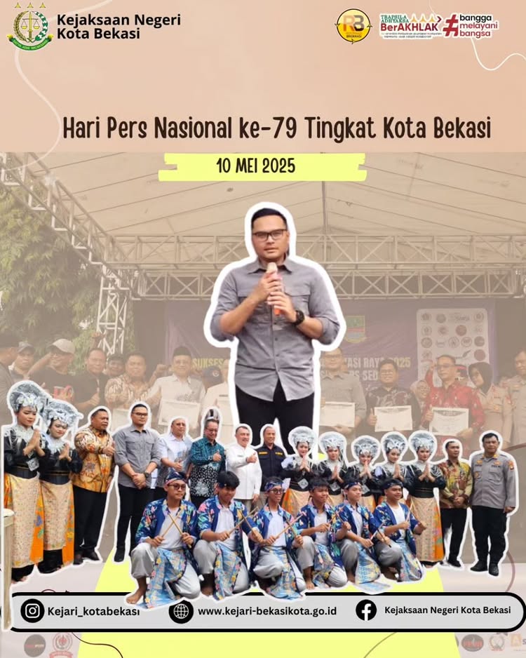 Sabtu, 10 Mei 2025 Kepala Seksi Intelijen Kota Bekasi Ryan Anugrah, S.H. mewakili Kepala Kejaksaan Negeri Kota Bekasi hadir dalam kegiatan Hari Pers Nasional 2025 Bekasi Raya yang diselenggarakan di Gedung Juang, Tambun Selatan, Kabupaten Bekasi.