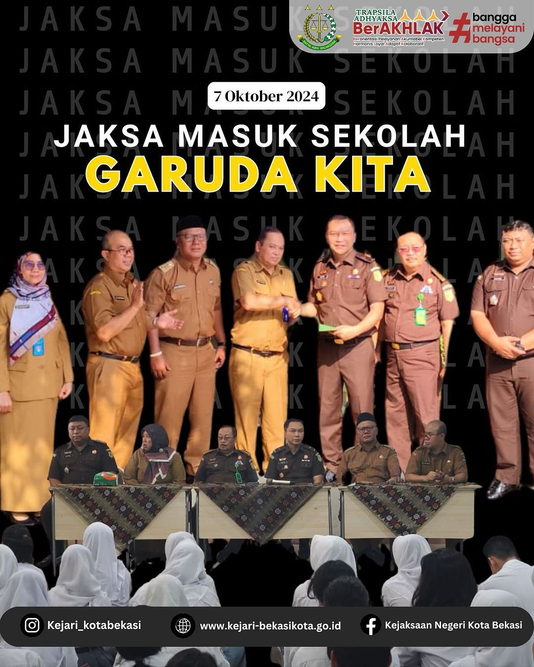 Senin, 07 Oktober 2024 Kegiatan Jaksa Masuk Sekolah yang diadakan di SMA N 3 Bekasi dan SMA N 6 Bekasi serta menjadikan SMAN 3 Bekasi dan SMAN 6 Bekasi sebagai pilot project Program GARUDA KITA (Menjaga Ruang Budaya Karakter Indonesia yang Tangguh) Tahun 2024.