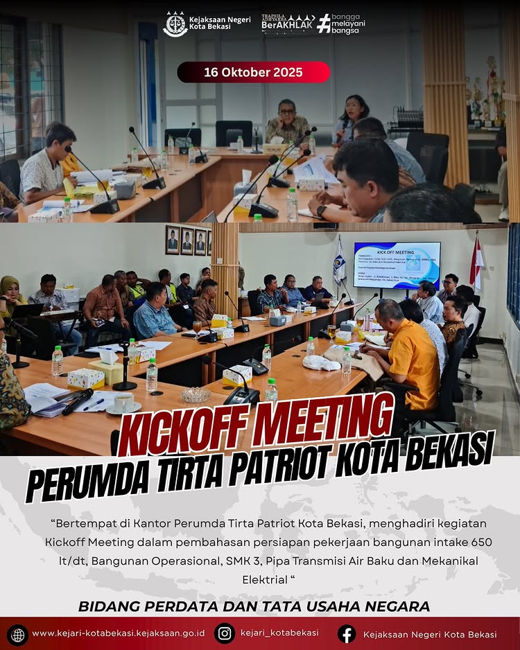Kejaksaan Negeri Kota Bekasi melalui Bidang Perdata dan Tata Usaha Negara (DATUN) menghadiri kegiatan Kickoff Meeting Perumda Tirta Patriot Kota Bekasi, dalam rangka pembahasan persiapan pekerjaan pembangunan intake 650 lt/dt, bangunan operasional, SMK 3, pipa transmisi air baku, serta mekanikal elektrikal.
