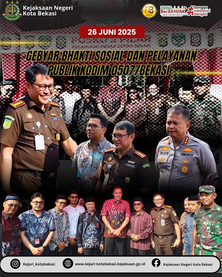 Kamis, 26 Juni 2025. Bertempat di Alun- alun M. Hasibuan Kota Bekasi Kepala Kejaksaan Negeri Kota Bekasi Bp. Imran Yusuf, S.H., M.H. menghadiri Kegiatan Program Bhakti Sosial (Baksos) Kodim 0507/Bekasi dalam rangka “Abdi Negara Nganjang Ka Warga”.
