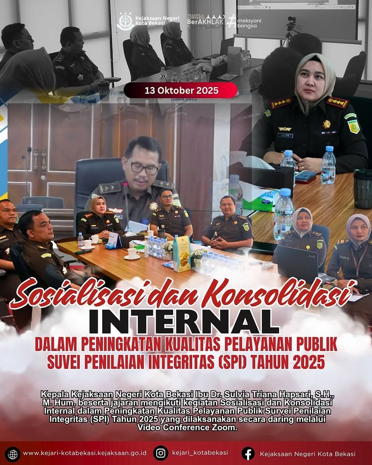 Kepala Kejaksaan Negeri Kota Bekasi Dr. Sulvia Triana Hapsari, S.H., M.Hum. beserta jajaran mengikuti kegiatan Sosialisasi dan Konsolidasi Internal dalam Peningkatan Kualitas Pelayanan Publik – Survei Penilaian Integritas (SPI) Tahun 2025 yang dilaksanakan secara daring melalui Zoom yang dilaksanakan pada Senin, 13 Oktober 2025.