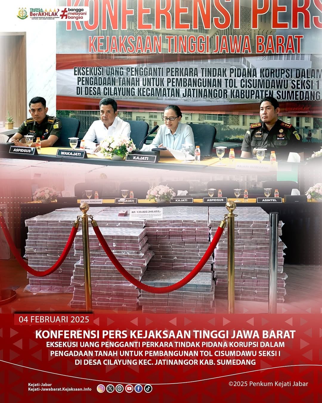 Pada hari Selasa, tanggal 04 februari 2025. Bertempat di Lobby Kejati Jabar, Dilakukan Konferensi Pers Kejaksaan Tinggi Jawa Barat bersama Kejaksaan Negeri Sumedang dalam rangka eksekusi uang pengganti hasil dari Tindak Pidana Korupsi dalam pengadaan tanah untuk pembangunan Tol Cisumdawu seksi 1 di Desa Cilayung Kecamatan Jatinangor Kabupaten Sumedang.