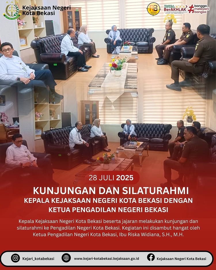 Pada hari ini, Kepala Kejaksaan Negeri Kota Bekasi beserta jajaran melakukan kunjungan dan silaturahmi ke Pengadilan Negeri Kota Bekasi. Kegiatan ini disambut hangat oleh Ketua Pengadilan Negeri Kota Bekasi, Ibu Riska Widiana, S.H., M.H.