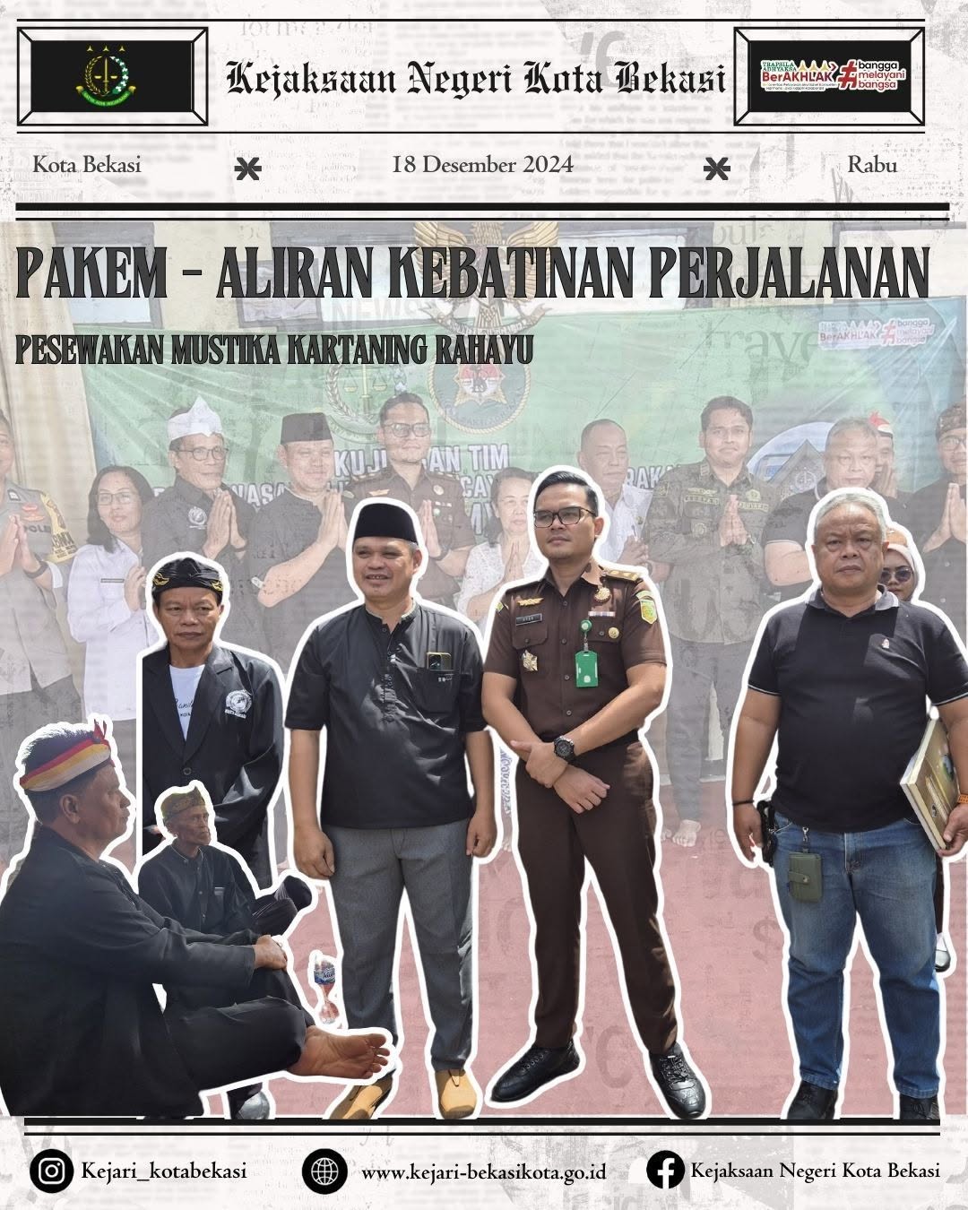 Rabu, 18 Desember 2024, bertempat di Pesewakan Mustika Kartaning Rahayu , Tim PAKEM yang dipimpin oleh Kepala Seksi Intelijen Ryan Anugrah, S.H. melakukan pengawasan serta diskusi dengan Aliran Kebatinan Perjalanan yang ada di Kelurahan Mustikasari.
