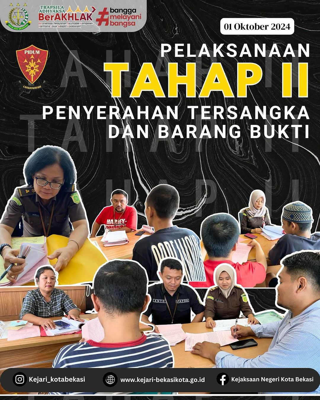 Pada hari Selasa, 02 Oktober 2024 telah dilakukan Tahap II (Penyerahan Tersangka dan Barang Bukti) dari penyidik kepolisian. Terhadap tersangka dilakukan penahanan oleh Jaksa Penuntut Umum dititipkan ke Rutan Lapas Kelas IIA Bekasi sejumlah 25 terdakwa.