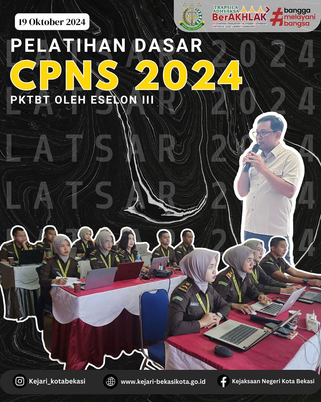 Sabtu, 19 Oktober 2024, telah dilaksanakan Pelatihan Dasar CPNS 2024 dengan materi PKTBT dengan Kepala Kejaksaan Negeri Kota Bekasi Imran Yusuf,S.H.,M.H. selaku pemateri yang diikuti oleh seluruh CPNS di lingkungan Kejaksaan Negeri Kota Bekasi yang dilaksanakan di Ruang Serbaguna Lt.5 Kejari Kota Bekasi.