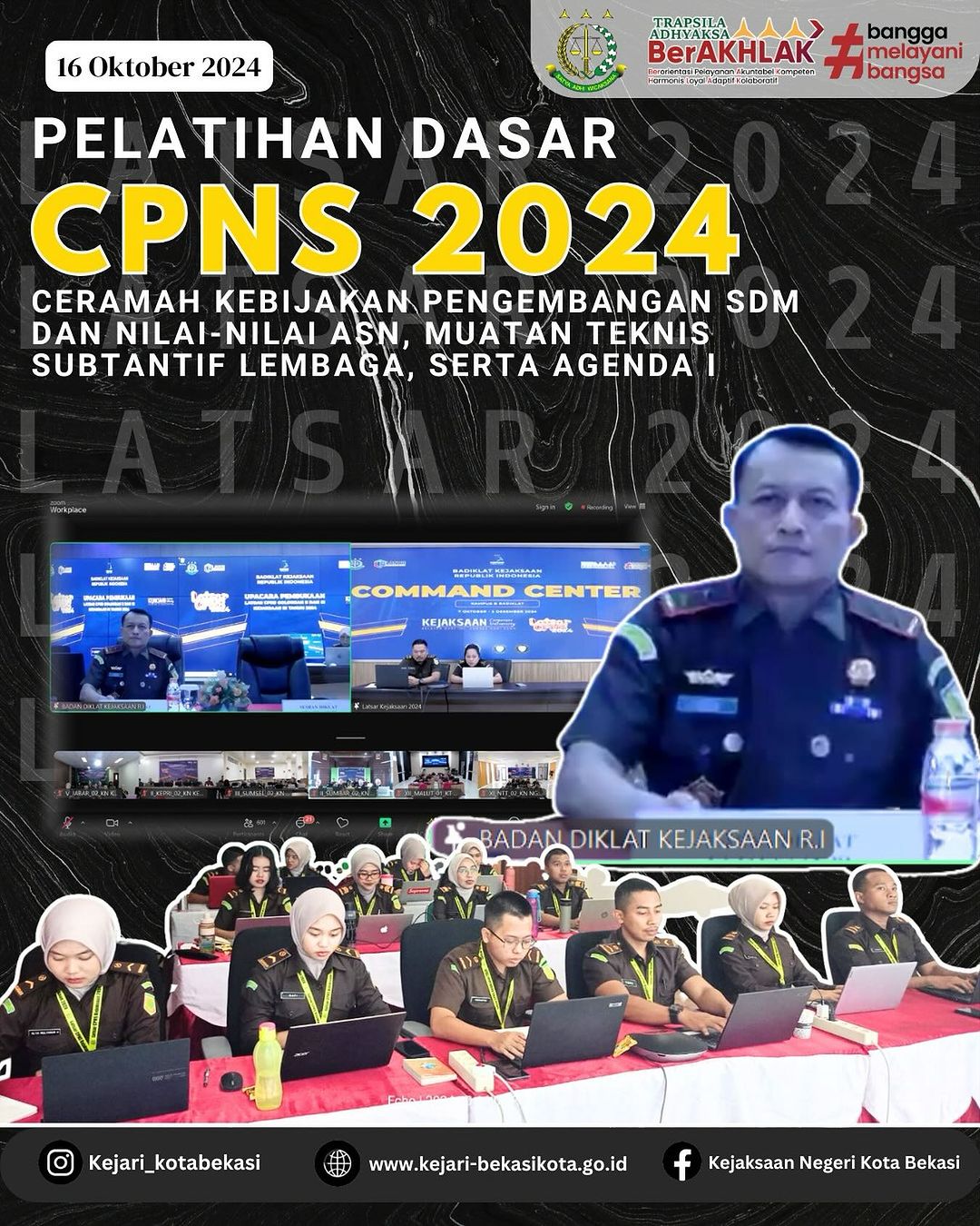 Rabu, 16 Oktober 2024, telah dilaksanakan Pelatihan Dasar dengan agenda ceramah kebijakan pengembangan sumber daya manusia aparatur dan nilai-nilai ASN, muatan teknis subtantif lembaga, serta agenda iyang diikuti oleh seluruh CPNS di lingkungan Kejaksaan Negeri Kota Bekasi yang dilaksanakan di Ruang Serbaguna Lt.5 Kejari Kota Bekasi.