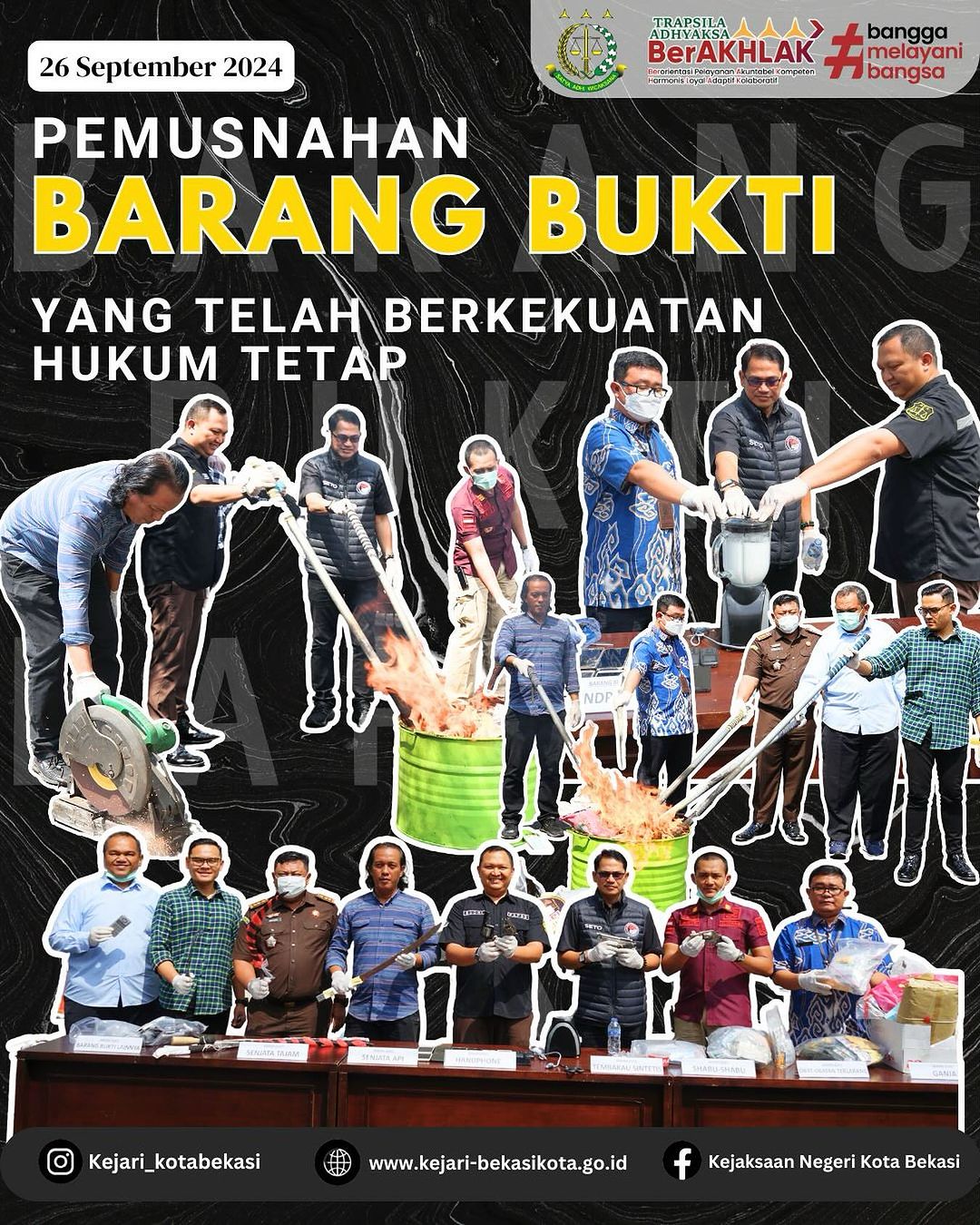 Kamis, 26 September 2024 bertempat di Kejaksaan Negeri Kota Bekasi, telah dilakukan pemusnahan terhadap barang bukti yang telah memiliki kekuatan hukum tetap. Kepala Seksi PAPBB Lier Budhi Trapsilo, S.H. menjelaskan barang bukti yang dimusnahkan mulai dari senjata tajam, senjata api, narkotika (sabu dan ganja), obat terlarang hingga telepon genggam.