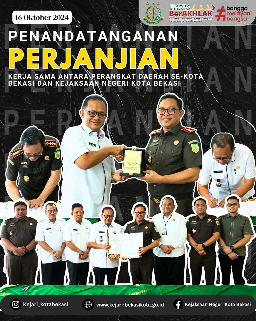 Rabu, 16 Oktober 2024, bertempat di Aula serbaguna Kejari Kota Bekasi, Kepala Kejaksaan Negeri Kota Bekasi Imran Yusuf, S.H. didampingi para kasi dan bidang Perdata dan Tata Usaha Negara melakukan penandatanganan kesepakatan kerjasama bersama Seluruh Pemerintah daerah Kota Bekasi.