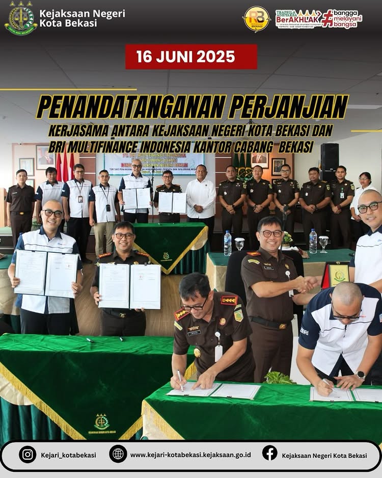 Senin, 16 Juni 2025, bertempat di Aula Lt.5 Kejaksaan Negeri Kota Bekasi, Kepala Kejaksaan Negeri Kota Bekasi Imran Yusuf, SH., MH. didampingi oleh para Kasi melaksanakan Penandatanganan Perjanjian Kerjasama antara Kejaksaan Negeri Kota Bekasi dan BRI Multifinance Kantor Cabang Bekasi terkait bidang hukum perdata dan tata usaha negara.