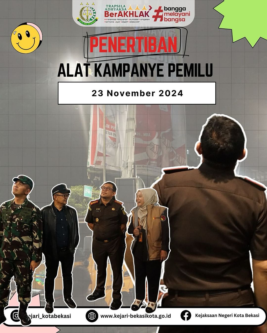 Sabtu, 23 November 2024, bertempat di Islamic Center Bekasi, Kepala Kejaksaan Negeri Kota Bekasi Imran Yusuf, S.H., M.H. menghadiri Apel bersama yang diadakan oleh Badan Pengawas Pemilu dengan PJ Walikota Bekasi beserta Forkopimda guna menandai mulainya masa tenang pemilihan kepala daerah dan dilanjutkan dengan menertibkan Alat Peraga Kampanye di sekitaran jalan Ahmad Yani, Kota Bekasi.