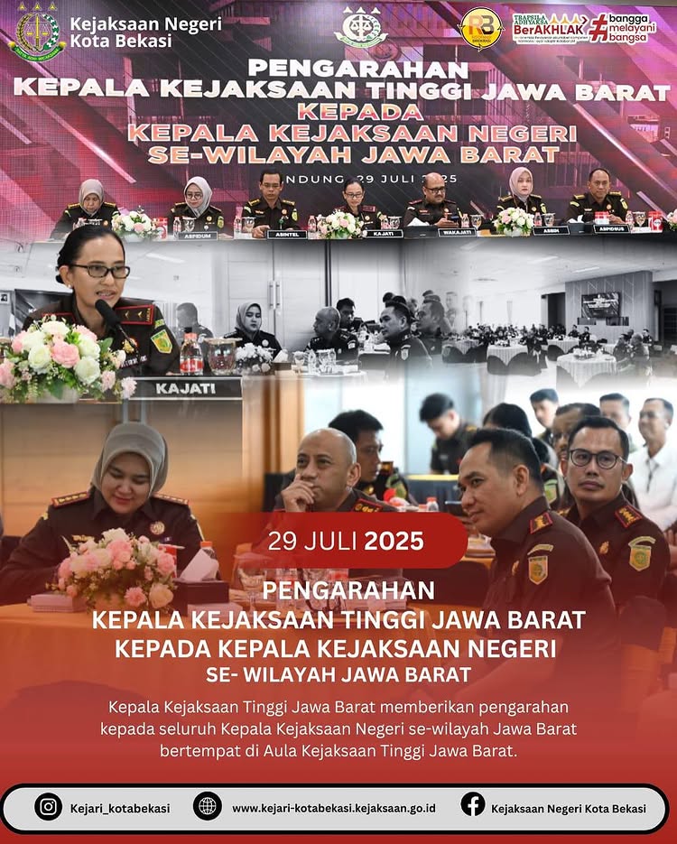 Pada hari Selasa, 29 Juli 2025, Kepala Kejaksaan Tinggi Jawa Barat memberikan pengarahan kepada seluruh Kepala Kejaksaan Negeri se-wilayah Jawa Barat bertempat di Aula Kejaksaan Tinggi Jawa Barat.