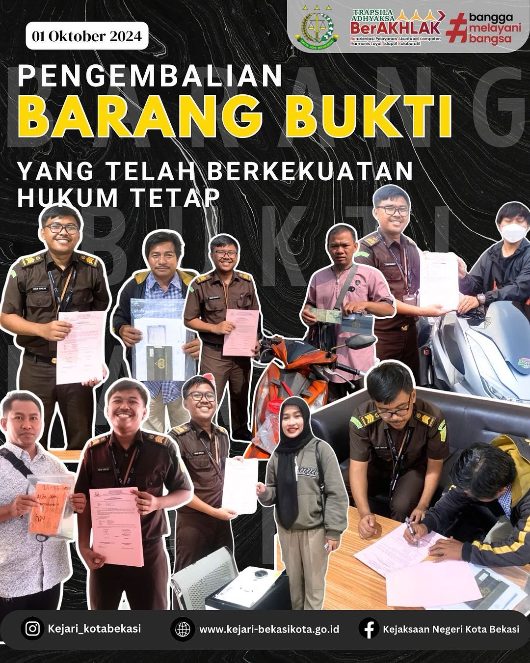 Seksi Pengelolaan Barang Bukti dan Barang Rampasan (PB3R) Kejaksaan Negeri Kota Bekasi melaksanakan pengembalian barang bukti kepada pemilik terhadap perkara yang telah berkekuatan hukum tetap dalam rangka menjalankan Pasal 6a UU Nomor 8 Tahun 1981 yaitu Jaksa selain bertindak sebagai penuntut umum, juga berwenang melaksanakan putusan pengadilan yang telah berkekuatan hukum tetap.