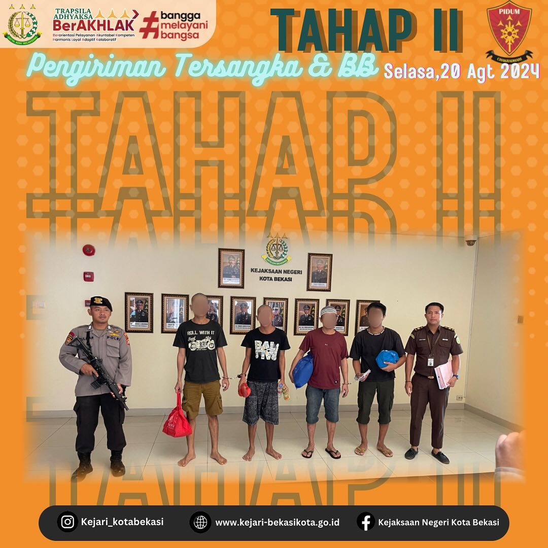 Pada hari Selasa, 20 Agustus 2024 telah dilakukan Tahap II (Pengiriman Tersangka dan Barang Bukti) dari penyidik, oleh Jaksa Penuntut Umum dengan perkara penggelapan dan penyalahgunaan narkoba yang dititipkan ke Rutan Lapas Kelas IIA Bekasi.
