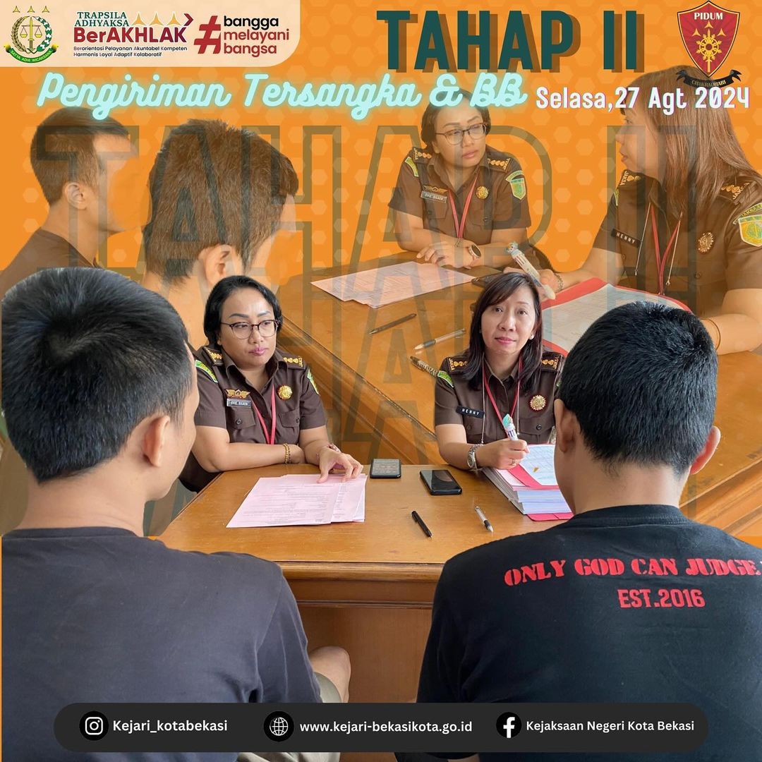 Pada hari Selasa, 27 Agustus 2024 telah dilakukan Tahap II (Pengiriman Tersangka dan Barang Bukti) dari penyidik. Tersangka dilakukan penahanan oleh Jaksa Penuntut Umum dititipkan ke Rutan Lapas Kelas IIA Bekasi.