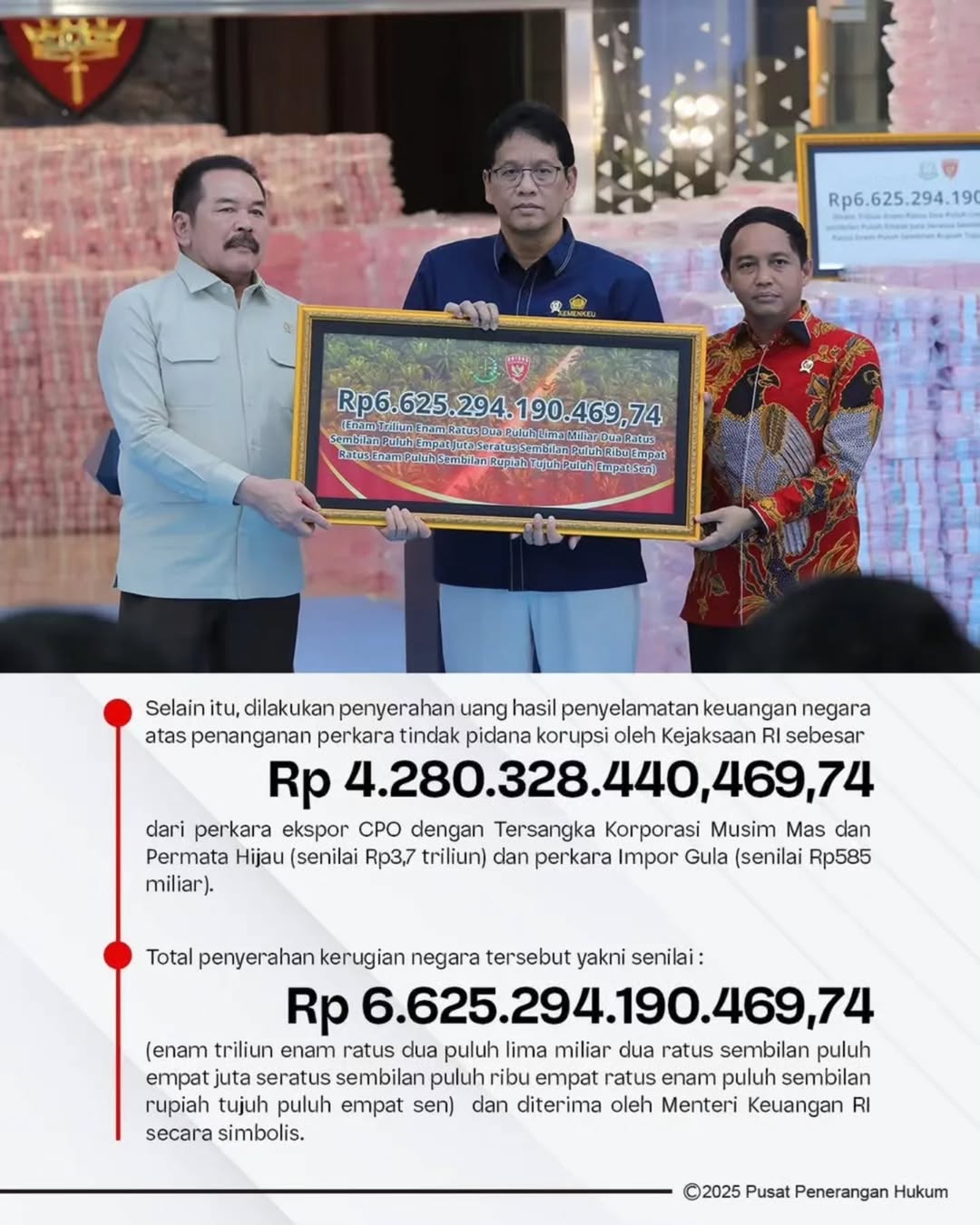 Total penyerahan kerugian negara tersebut yakni senilai Rp6.625.294.190.469,74 (enam triliun enam ratus dua puluh lima miliar dua ratus sembilan puluh empat juta seratus sembilan puluh ribu empat ratus enam puluh sembilan rupiah tujuh puluh empat sen) dan diterima oleh Menteri Keuangan RI secara simbolis.