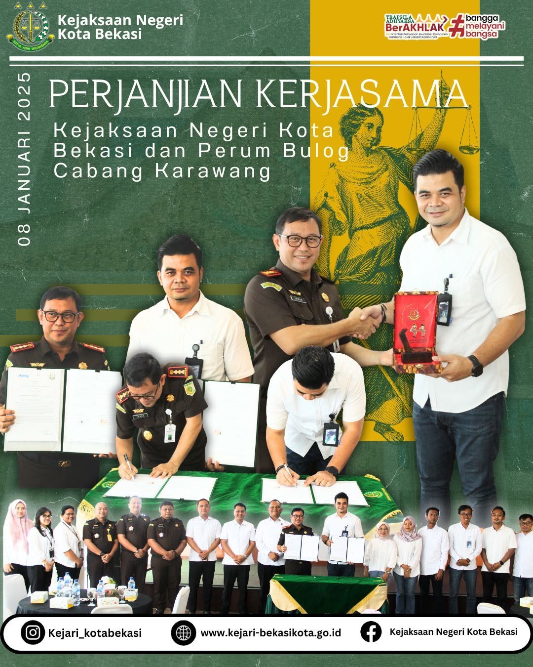 Rabu, 08 Januari 2025, bertempat di Aula Lt.5 Kejaksaan Negeri Kota Bekasi, Kepala Kejaksaan Negeri Kota Bekasi Imran Yusuf, S.H., M.H. melakukan penandatanganan perjanjian kerja bersama Perusahaan Umum (Perum) Bulog Cabang Karawang terkait permasalahan hukum seputar Perdata dan Tata Usaha Negara.