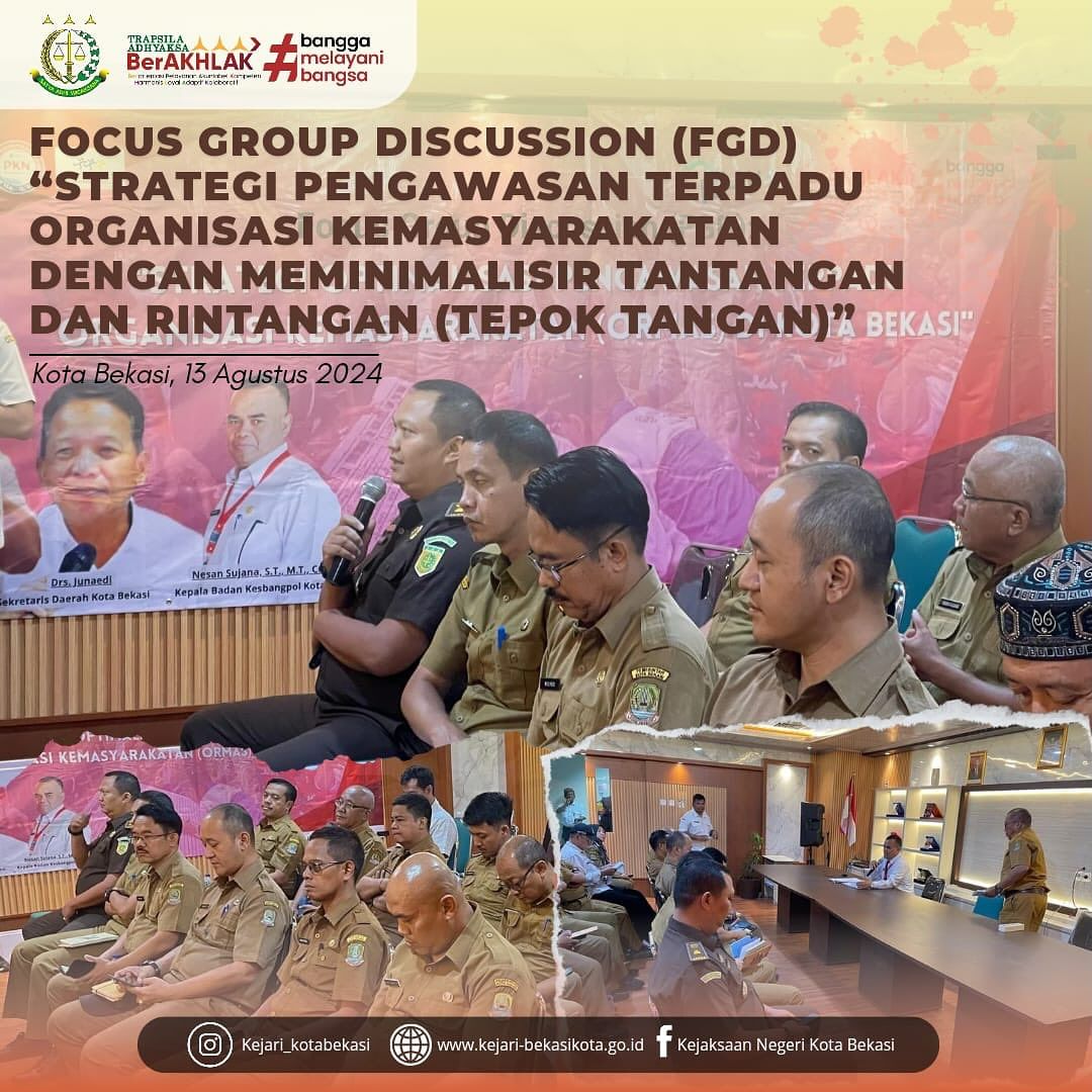 Bahwa Pada hari Selasa tanggal 13 Agustus 2024 Pukul 14.00 WIB, bertempat di Kantor Badan Kesatuan Bangsa dan Politik Kota Bekasi Jl. Ahmad Yani No.1 Kel. Marga Jaya Kec. Bekasi Selatan Kota Bekasi, Jawa Barat 17143 telah dilaksanakan Pertemuan Focus Group Discussion (FGD) dengan tema “Strategi Pengawasan Terpadu Organisasi Kemasyarakatan Dengan Meminimalisir Tantangan Dan Rintangan (Tepok Tangan)”.