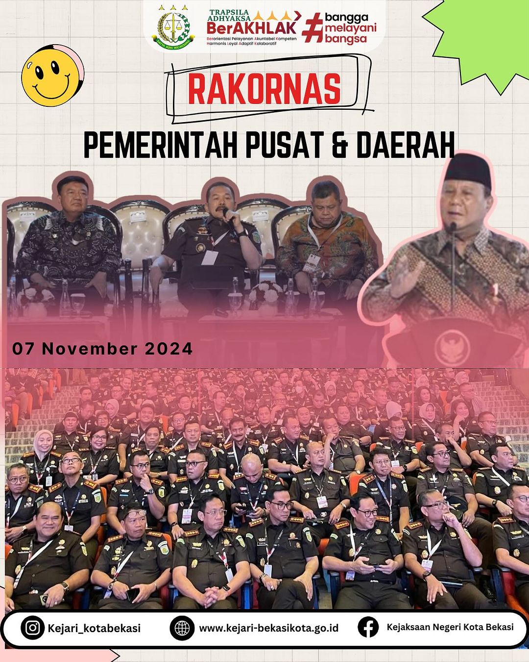 Kepala Kejaksaan Negeri Kota Bekasi Imran Yusuf, S.H., M.H. telah menghadiri Rapat Koordinasi Nasional Pemerintah Pusat dan Daerah Tahun 2024. Dalam Rapat Koordinasi Nasional Pemerintah Pusat dan Daerah Tahun 2024 yang diselenggarakan Kamis 7 November 2024 di Sentul, Bogor, Jaksa Agung Republik Indonesia ST Burhanuddin menyampaikan pentingnya peran pemerintah daerah dalam memperkuat pencegahan dan pemberantasan korupsi.