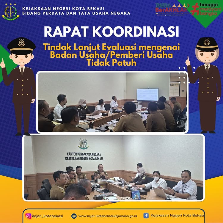 Senin, 23 Juni 2025 bertempat di Ruang Rapat Kejaksaan Negeri Kota Bekasi, Tim Jaksa Pengacara Negara pada Kejaksaan Negeri Kota Bekasi melakukan Rapat Koordinasi dengan BPJS BPJS Ketenagakerjaan Kantor Cabang Bekasi Kota dan Lurah setempat terkait Tindak Lanjut evaluasi mengenai badan usaha/pemberi usaha yang tidak patuh.