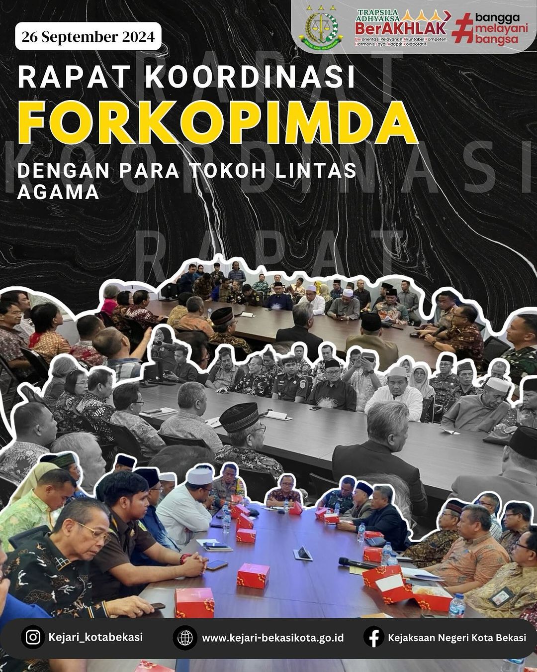 Pada hari Kamis, 26 September 2024 bertempat di Command center Pemerintah Kota Bekasi, Kasubsi A bidang Intelijen Kejari Kota Bekasi mengikuti rapat koordinasi yang diadakan Forkopimda Kota Bekasi dengan Para Tokoh Lintas Agama. Rapat koordinasi tersebut diadakan untuk mencari solusi atas persoalan oknum yang dianggap intoleran di Kota Bekasi mengingat Kota Bekasi yang telah menyandang predikat “Kota Toleran”