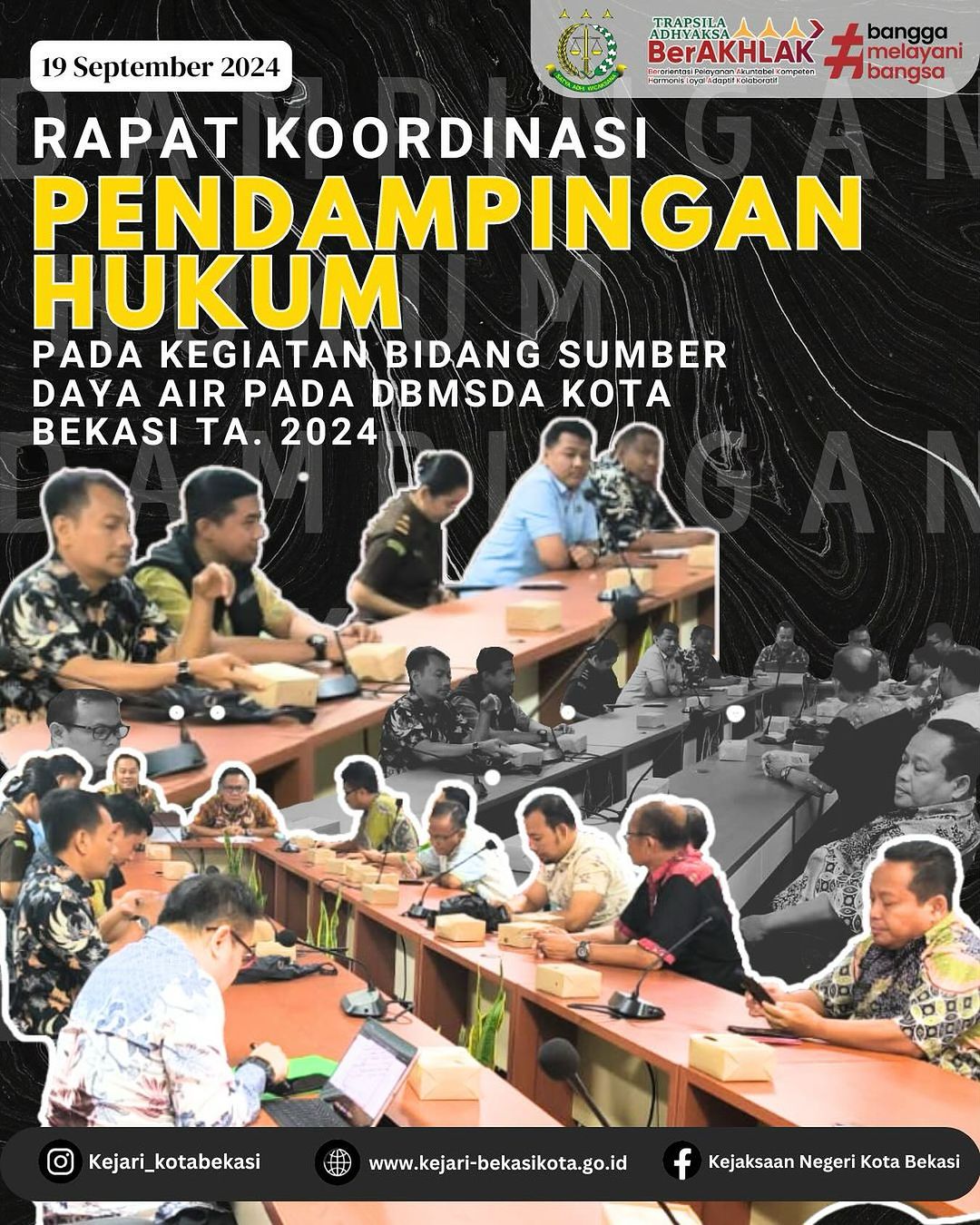 Pada Kamis, 19 September 2024 bertempat di ruang Rapat Dinas Sumber Daya Air dan Bina Marga Kota Bekasi telah dilaksanakannya Kegiatan Rapat Koordinasi Paket Pekerjaan Pembangunan Polder Vila Indah Permai dalam Hal Pendampingan Hukum pada Kegiatan Bidang Sumber Daya Air pada Dinas Bina Marga dan Sumber Daya Air (DBMSDA) Kota Bekasi Tahun Anggaran 2024 antara Kejaksaan Negeri Kota Bekasi melalui bidang Perdata dan Tata Usaha Negara dan Dinas Bina Marga dan Sumber Daya Air (DBMSDA) Kota Bekasi.