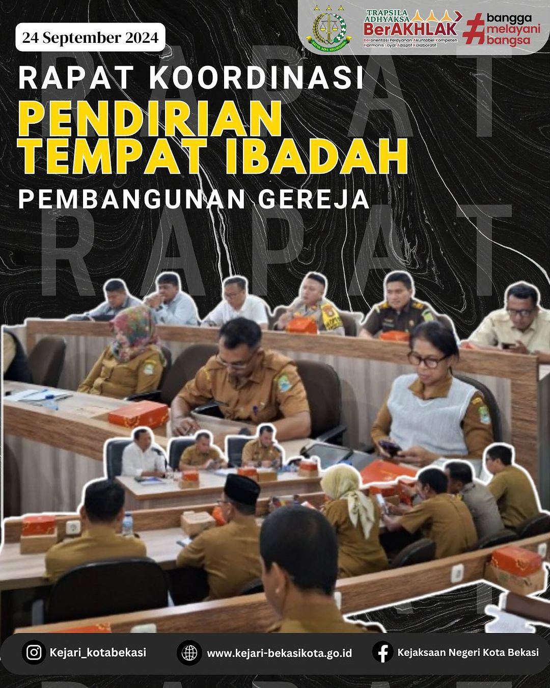 Dalam menindaklanjuti rencana pembangunan Gereja di Citra Grand Kel. Jatikarya Kec. Jatisampurna, Kasubsi B pada Bidang Intelijen Kejari Kota Bekasi Endro Adi Anggoro, S.H. telah mengikuti Rapat Koordinasi yang telah diadakan oleh Kesbangpol Pemerintah Kota Bekasi pada Selasa, 24 September 2024 di Ruang Rapat Walikota Bekasi.