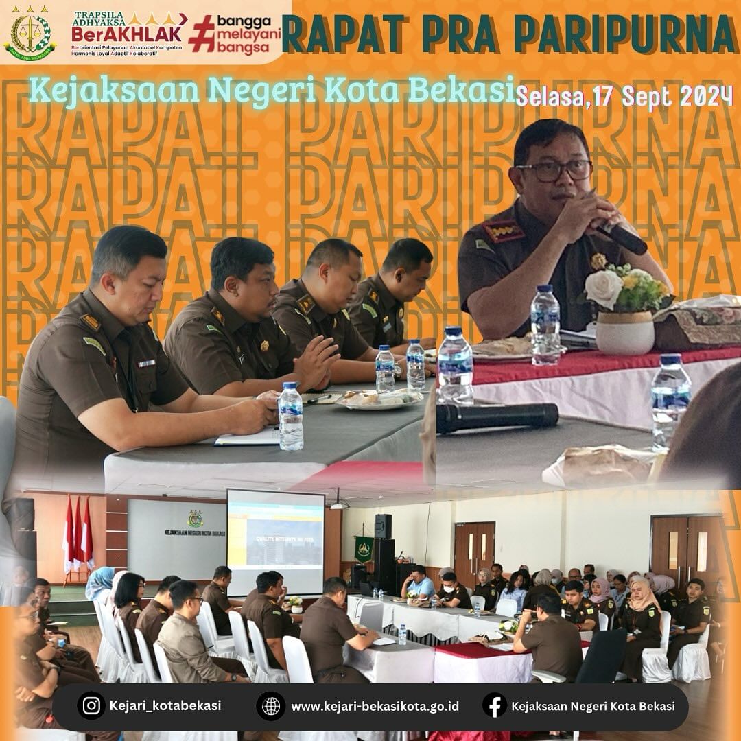 Selasa, 17 September 2024 di Aula Lt. 5 Kejaksaan Negeri Kota Bekasi telah dilaksanakan Rapat Pra Paripurna. Rapat ini dipimpin langsung oleh Kepala Kejaksaan Negeri Kota Bekasi Imran Yusuf, S.H., M.H. dan diikuti oleh seluruh pejabat struktural, jaksa fungsional dan operator dari setiap bidang.