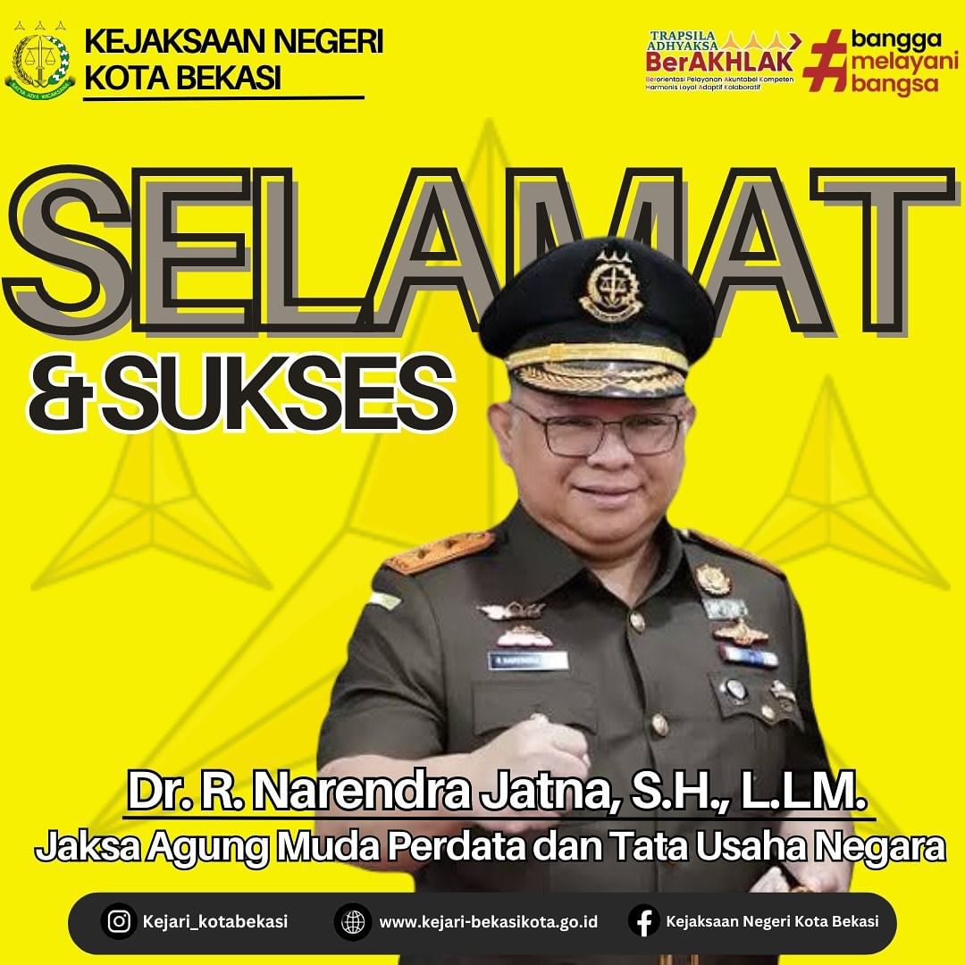 Kepala Kejaksaan Negeri Kota Bekasi Imran Yusuf, SH., MH. beserta seluruh jajaran dan staf mengucapkan Selamat dan Sukses atas Pelantikan Dr. R. Narendra Jatna, S.H., L.LM. sebagai Jaksa Agung Muda Bidang Perdata dan Tata Usaha Negara.