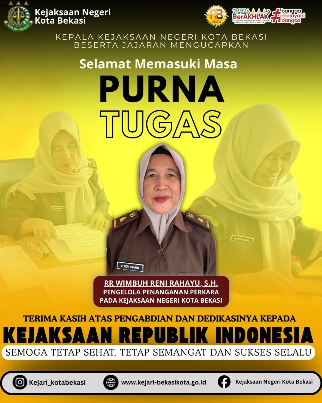 Segenap keluarga besar Kejaksaan Negeri Kota Bekasi mengucapkan Selamat memasuki masa purna tugas Ibu RR. Wimbuh Reni Rahayu, S.H. Pengelola Penanganan Perkara pada Kejaksaan Negeri Kota Bekasi.