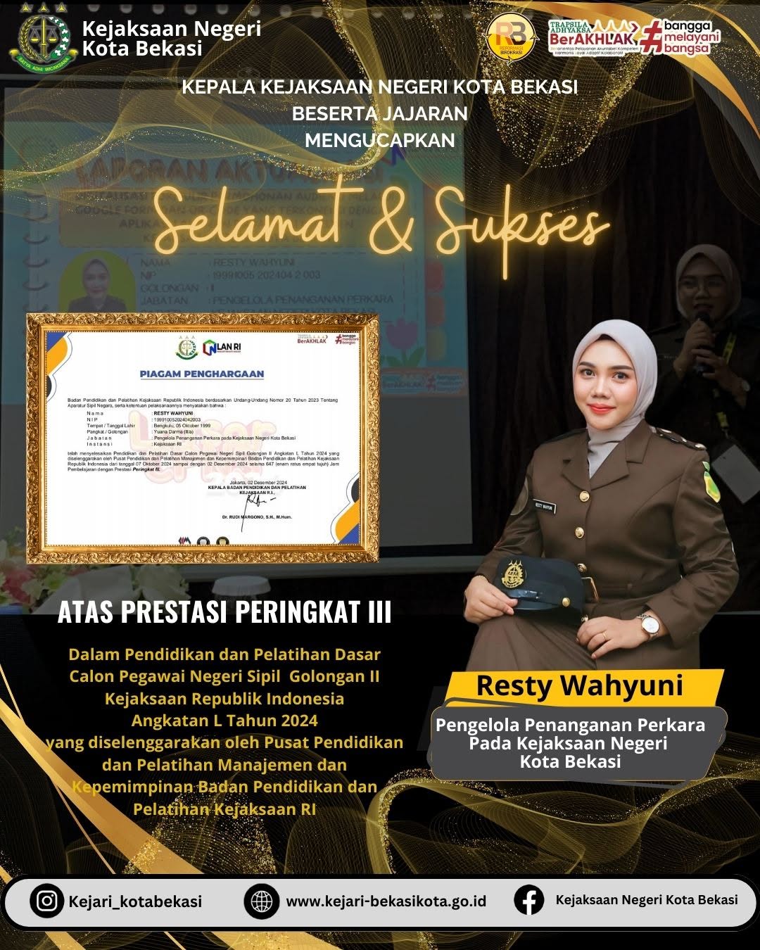 Kepala Kejaksaan Negeri Kota Bekasi Mengucapkan Selamat dan Sukses Kepada Resty Wahyuni, Pengelola Penanganan Perkara pada Kejaksaan Negeri Kota Bekasi atas Prestasi sebagai Peringkat III dalam Dalam Pendidikan dan Pelatihan Dasar Calon Pegawai Negeri Sipil Golongan II