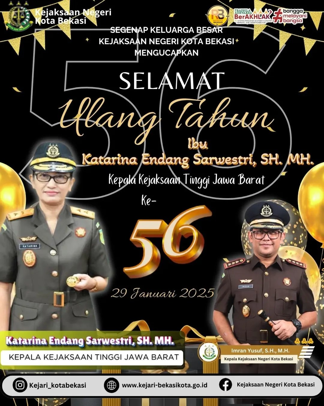 Segenap keluarga besar Kejaksaan Negeri Kota Bekasi mengucapkan Selamat ulang Tahun Kepala Kejaksaan Tinggi Jawa Barat Ibu Katarina Endang Sarwestri, S.H., M.H. ke – 56.