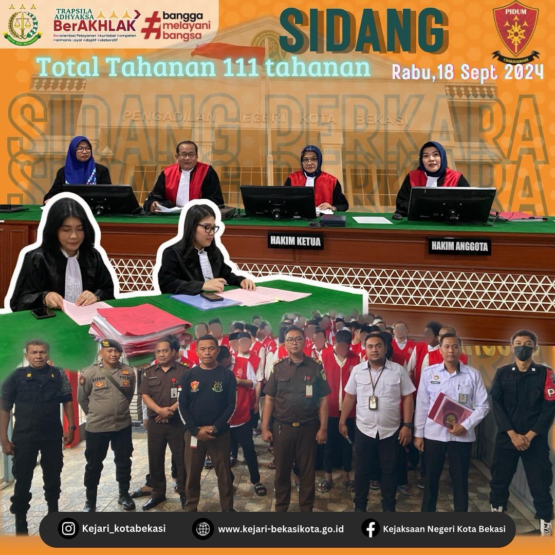 Sidang Perkara tindak pidana umum dengan banyak tahanan mencapai 111 tahanan disidangkan hari ini. Dari 111 tahanan terdapat berbagai macam perkara mulai dari pencurian, narkoba, hingga penggelapan dalam jabatan.