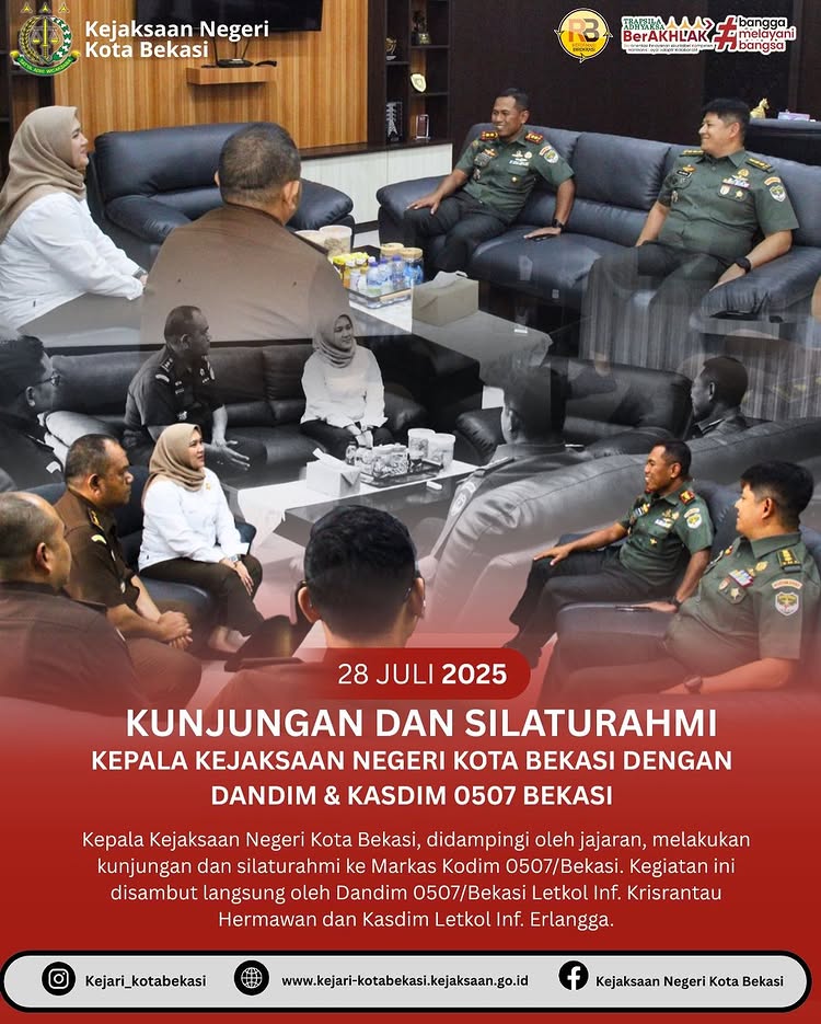 Pertemuan ini merupakan bentuk sinergi dan koordinasi antara Kejaksaan dan TNI dalam menjaga stabilitas, keamanan, serta mendukung penegakan hukum yang berkeadilan di wilayah Kota Bekasi.