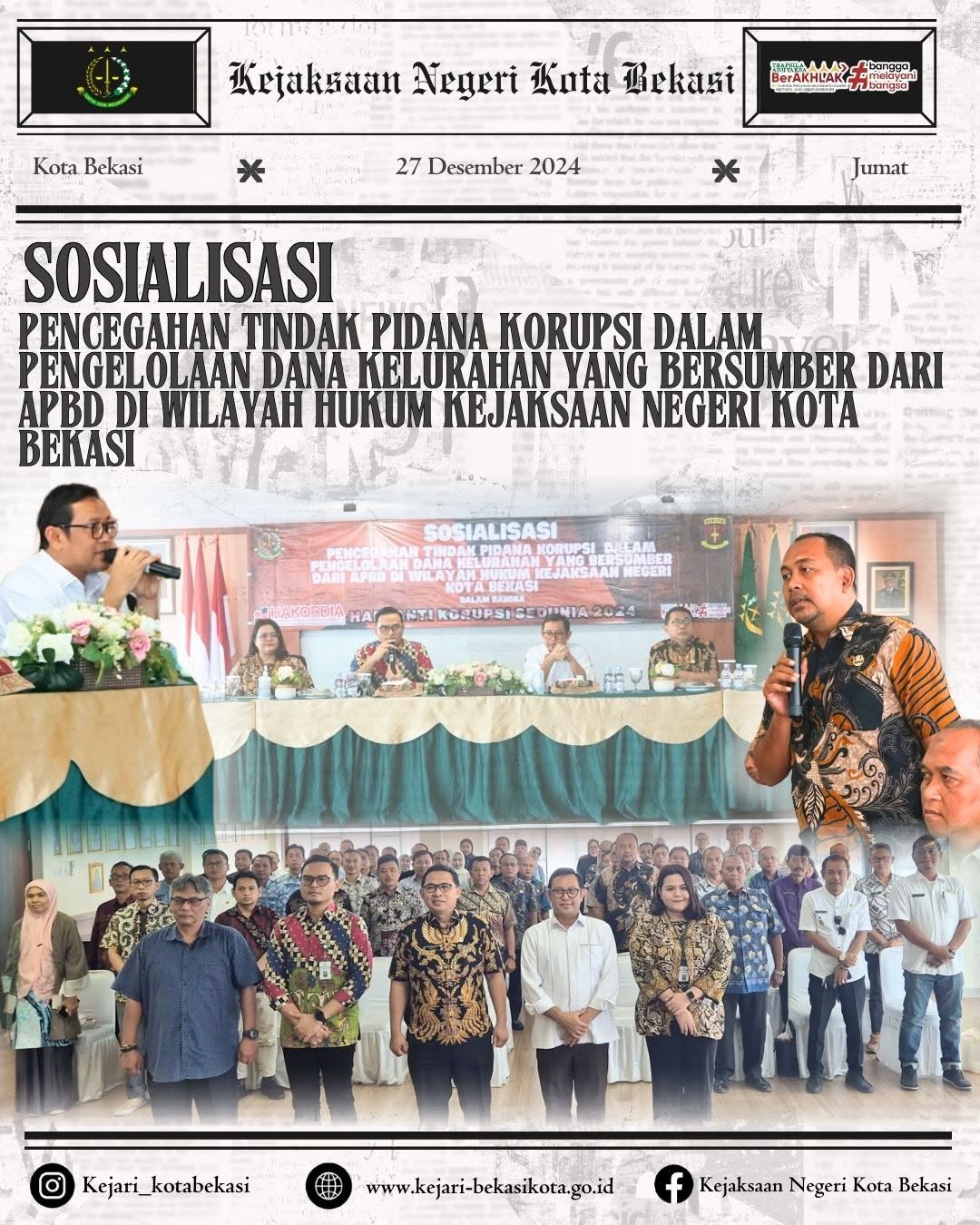 Jumat, 27 Desember 2024, bertempat di Aula Serbaguna Lt.5 Kejaksaan Negeri Kota Bekasi, Seksi Intelijen bersama dengan Seksi Tindak Pidana Khusus telah mengadakan kegiatan Sosialisasi dengan Tema “PENCEGAHAN TINDAK PIDANA KORUPSI DALAM PENGELOLAAN DANA KELURAHAN YANG BERSUMBER DARI APBD DI WILAYAH HUKUM KEJAKSAAN NEGERI KOTA BEKASI” dalam Rangka Hari Anti Korupsi Sedunia Tahun 2024 dengan Lurah di wilayah Kota Bekasi menjadi peserta Kota Bekasi menjadi peserta dalam kegiatan tersebut.
