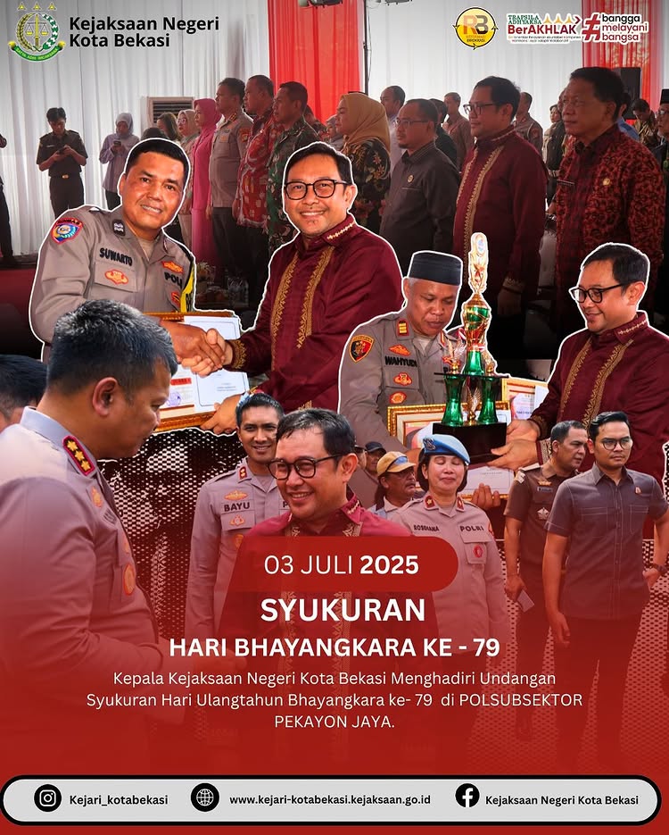 Kamis, 03 Juli 2025 Kepala Kejaksaan Negeri Kota Bekasi Bp. Imran Yusuf, S.H., M.H. didampingi Kepala Seksi Menghadiri Undangan Syukuran Hari Ulangtahun Bhayangkara ke- 79 sekaligus Peresmian & Peninjauan Polsubsektor Pekayon di POLSUBSEKTOR PEKAYON JAYA.