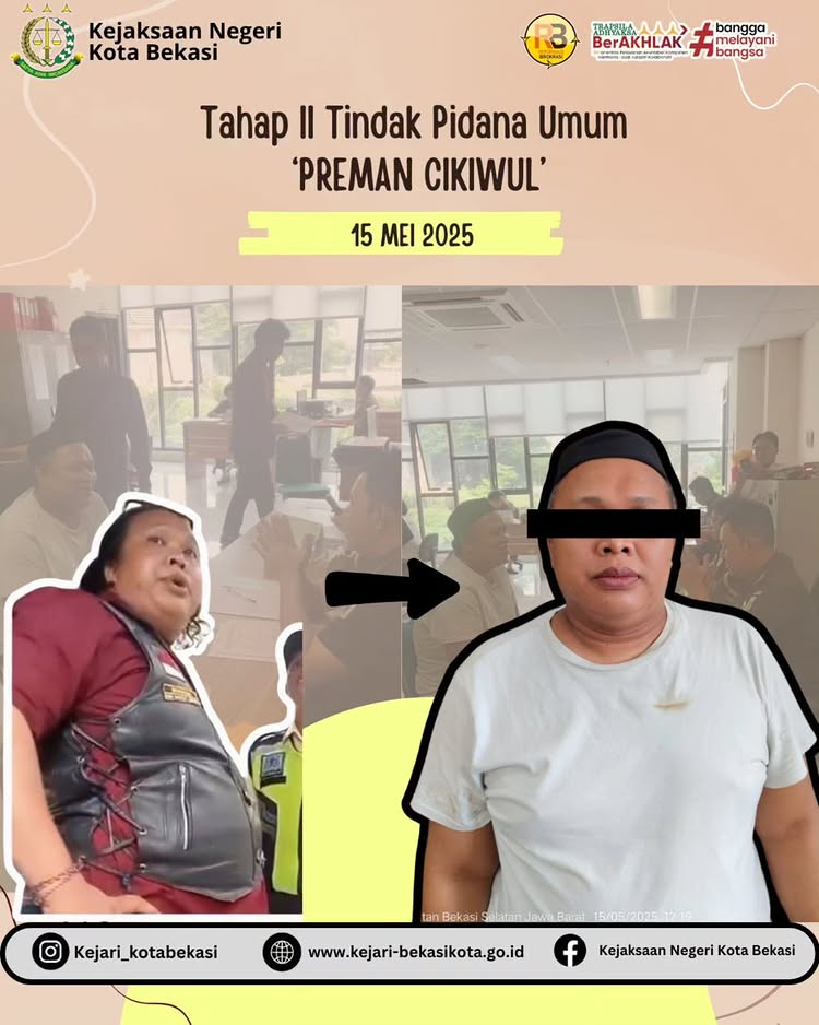 Rabu, tanggal 15 Mei 2025, Kejaksaan Negeri Kota Bekasi telah menerima pelimpahan tanggung jawab tersangka dan barang bukti dari penyidik (Tahap II) perkara tindak pidana umum atas nama tersangka Suhada Als Ada Bin Husein yang sebelumnya viral dengan sebutan “Preman Cikiwul”.
