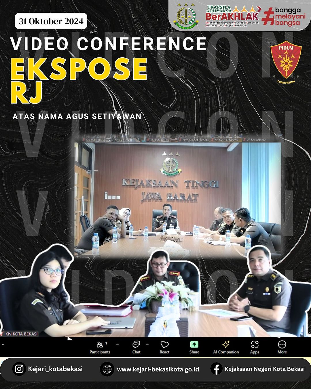Kamis, 31 Oktober 2024, bertempat di Ruang Vidcon Kejaksaan Negeri Kota Bekasi, Kepala Kejaksaan Negeri Kota Bekasi Imran Yusuf, S.H., M.H. beserta seluruh jajaran bidang Tindak Pidana Umum mengikuti ekspose Restorative Justice atas nama terpidana Agus Setiyawan yang dilaksanakan secara virtual melalui video conference zoom.